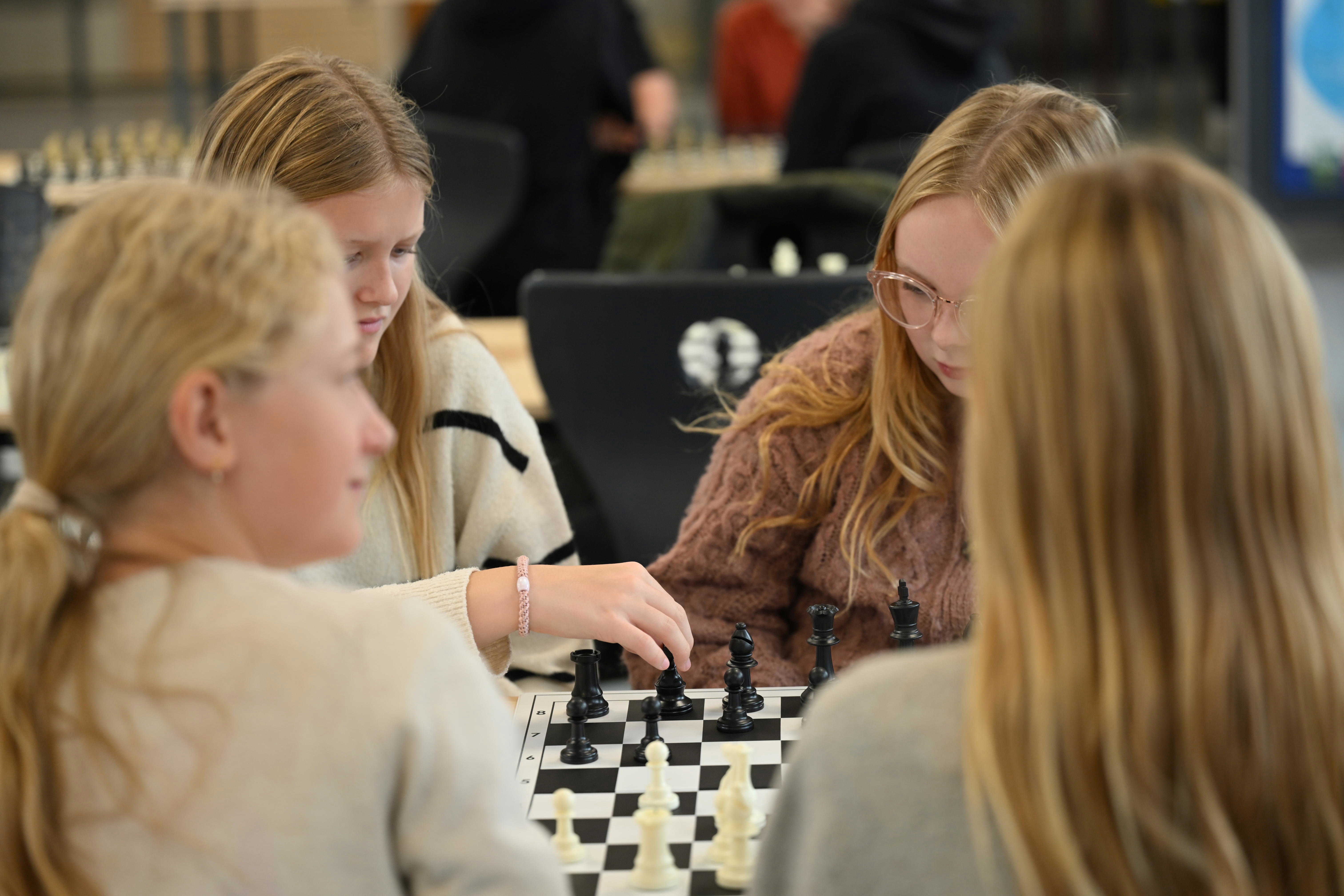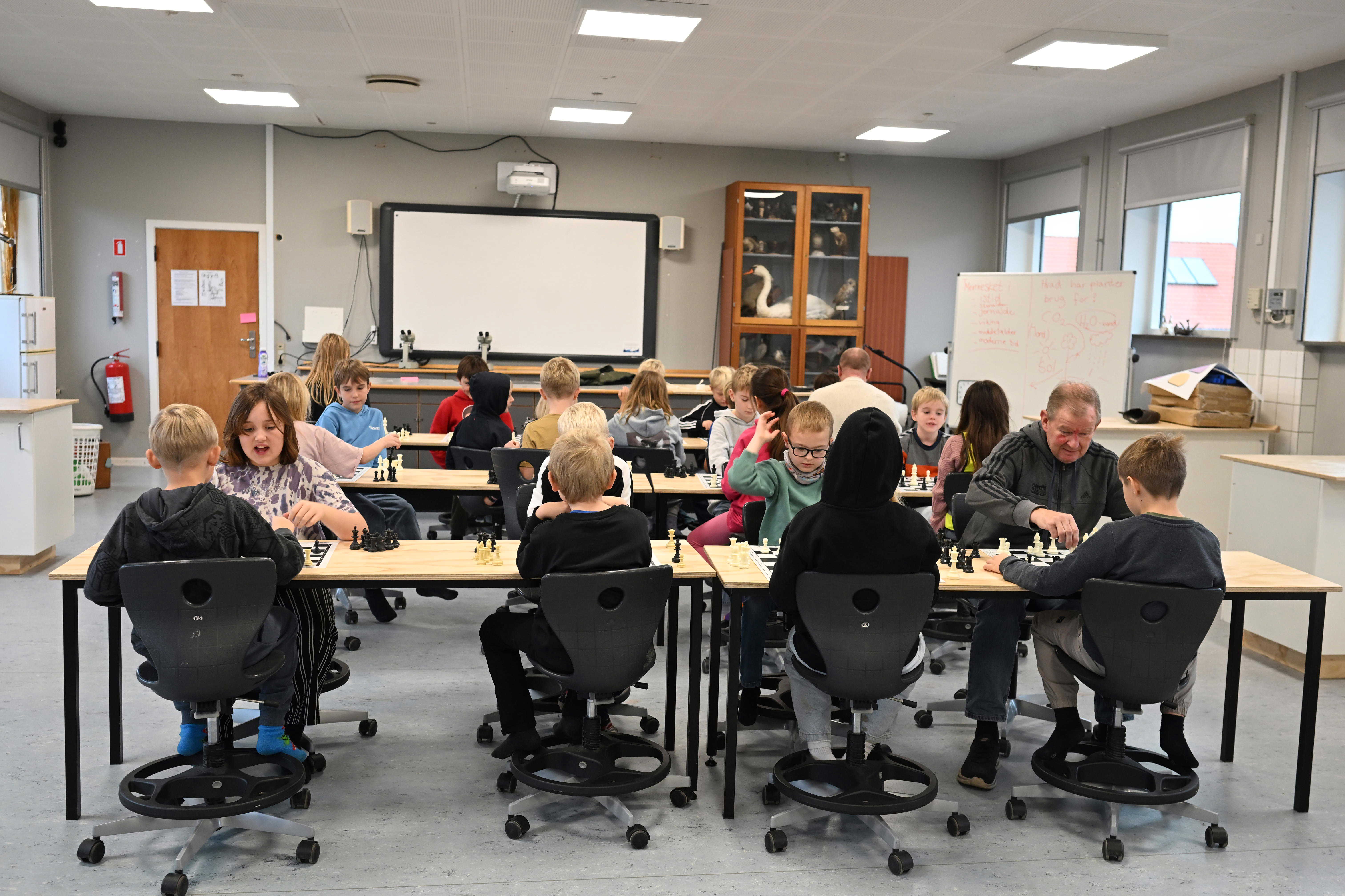 - Skak – på en anderledes måde. Udover at skulle tænke strategisk blev der løbende tilføjet nye udfordringer. Blandt andet skulle eleverne spille i par, hvor den ene var ”hjernen”, der udtænkte trækkene, mens den anden var ”armen”, der flyttede brikkerne. De måtte ikke tale sammen, men skulle samarbejde ud fra klare instruktioner – en øvelse i logik, koordinering og forudsigelse, som en del af matematikken.