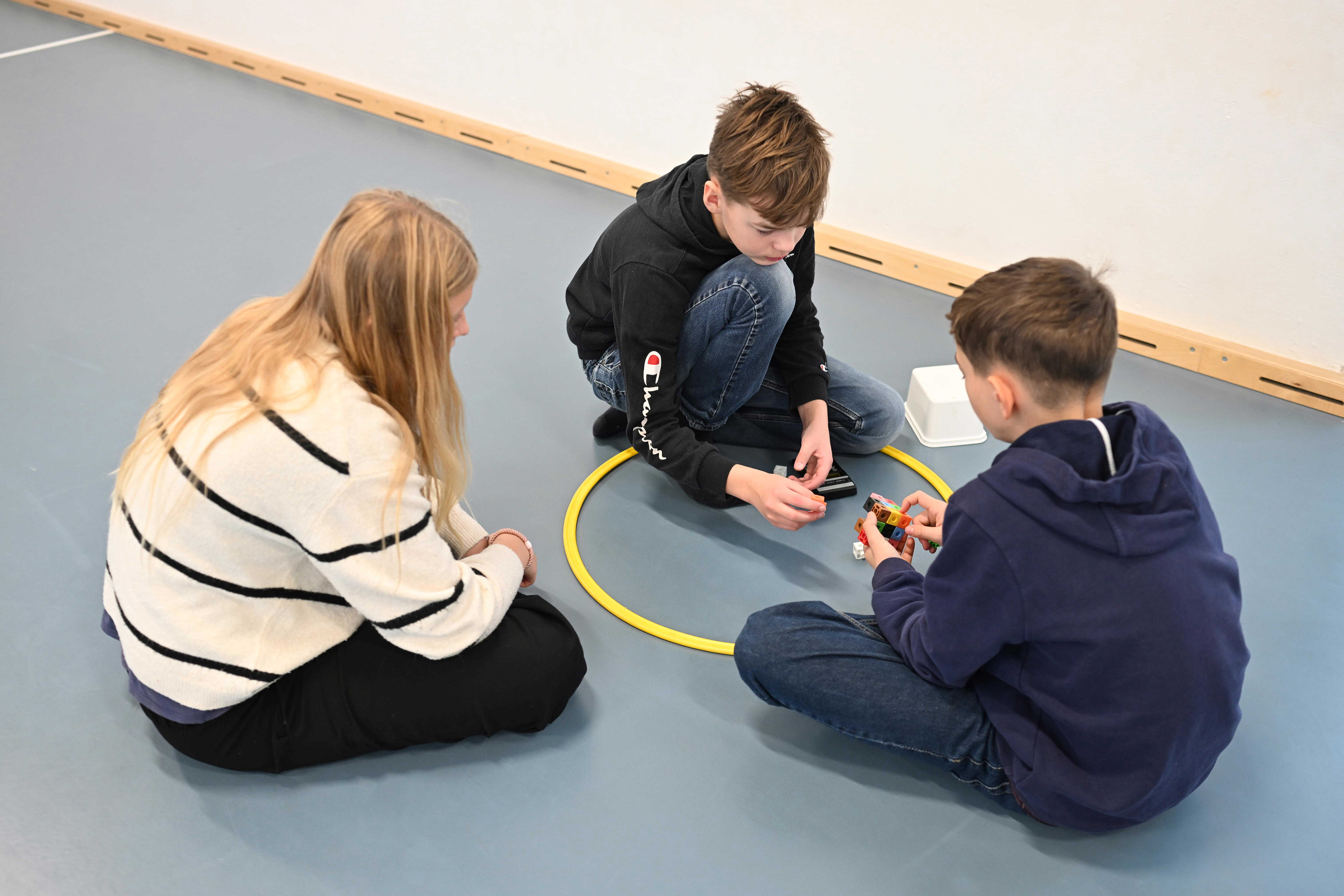 - I Multihallen stod den på fællesopgave med at få placeret hinanden efter højde – fra høj til lav. Derefter fulgte forskellige gruppeopgaver. Blandt andet skulle hver gruppe bygge en stor terning af mindre klodser, uden at samme farve måtte gentages på siderne – en sjov udfordring i systematik, og logisk tænkning.