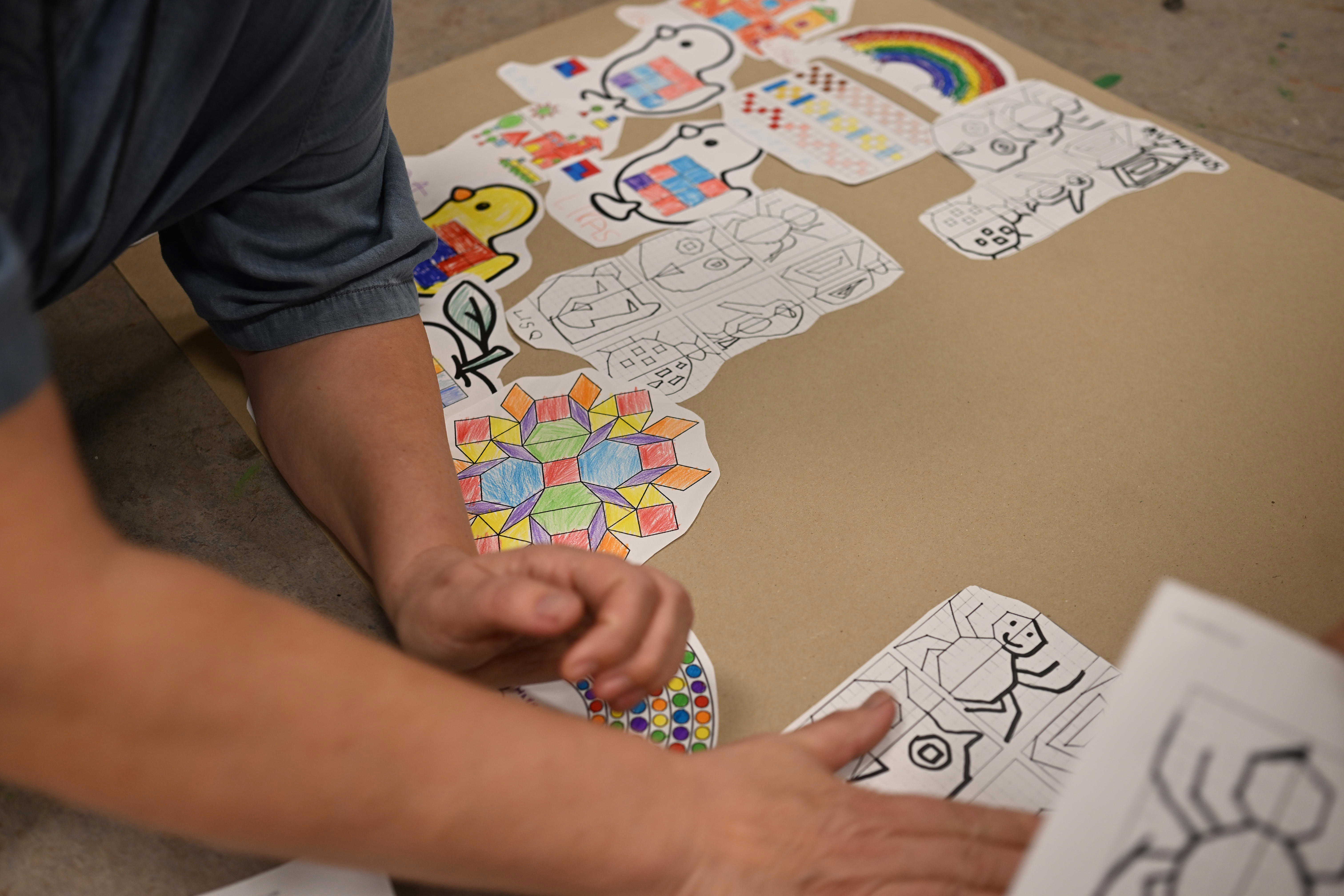 - I det kreative værksted blev der arbejdet med former og figurer på mange måder. Eleverne skulle blandt andet skabe mønstre og billeder ud fra spejlinger, drejninger og parallelforskydninger. Her blev matematikken gjort håndgribelig, når eleverne med farver, papir lavede flotte geometriske mønstre.