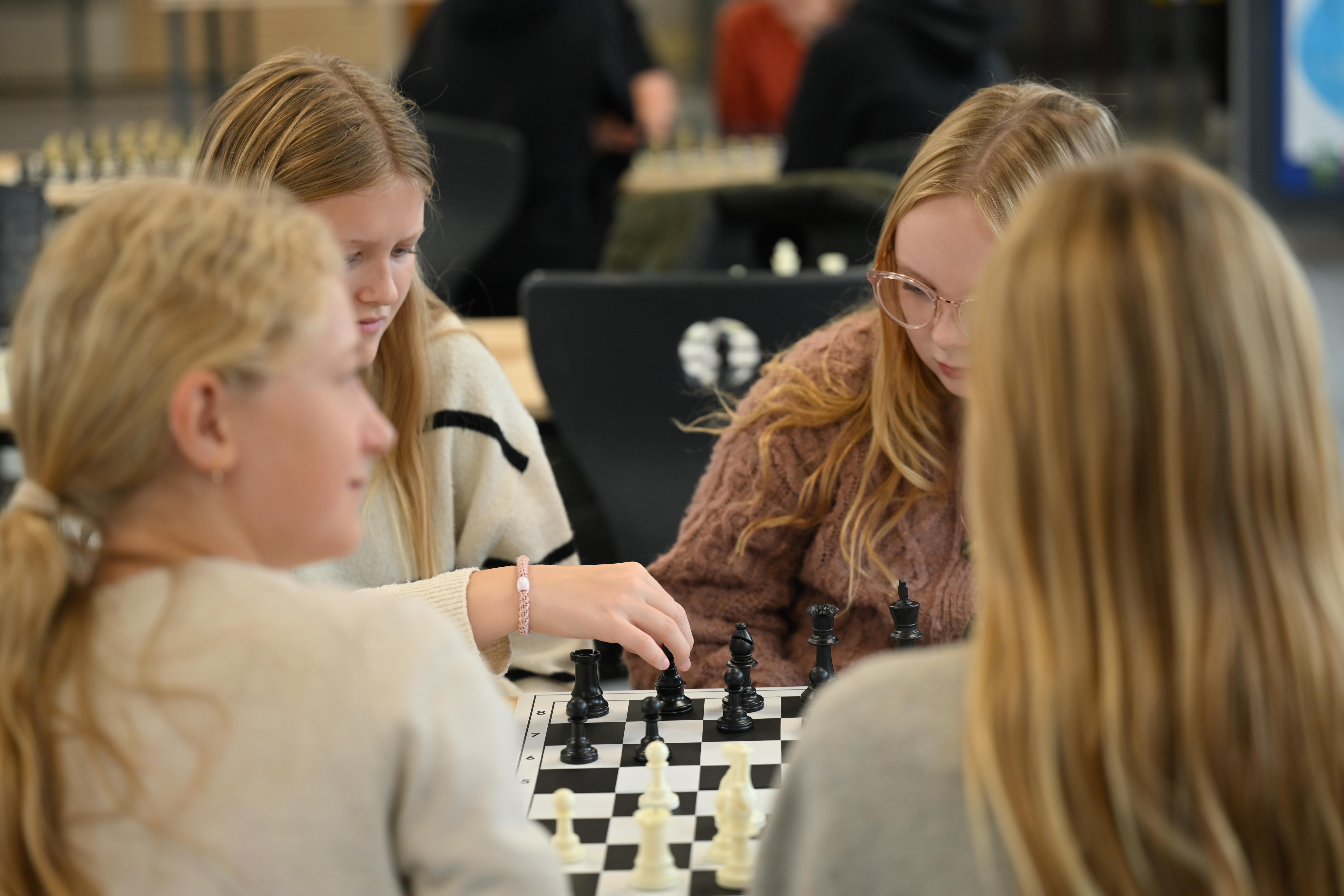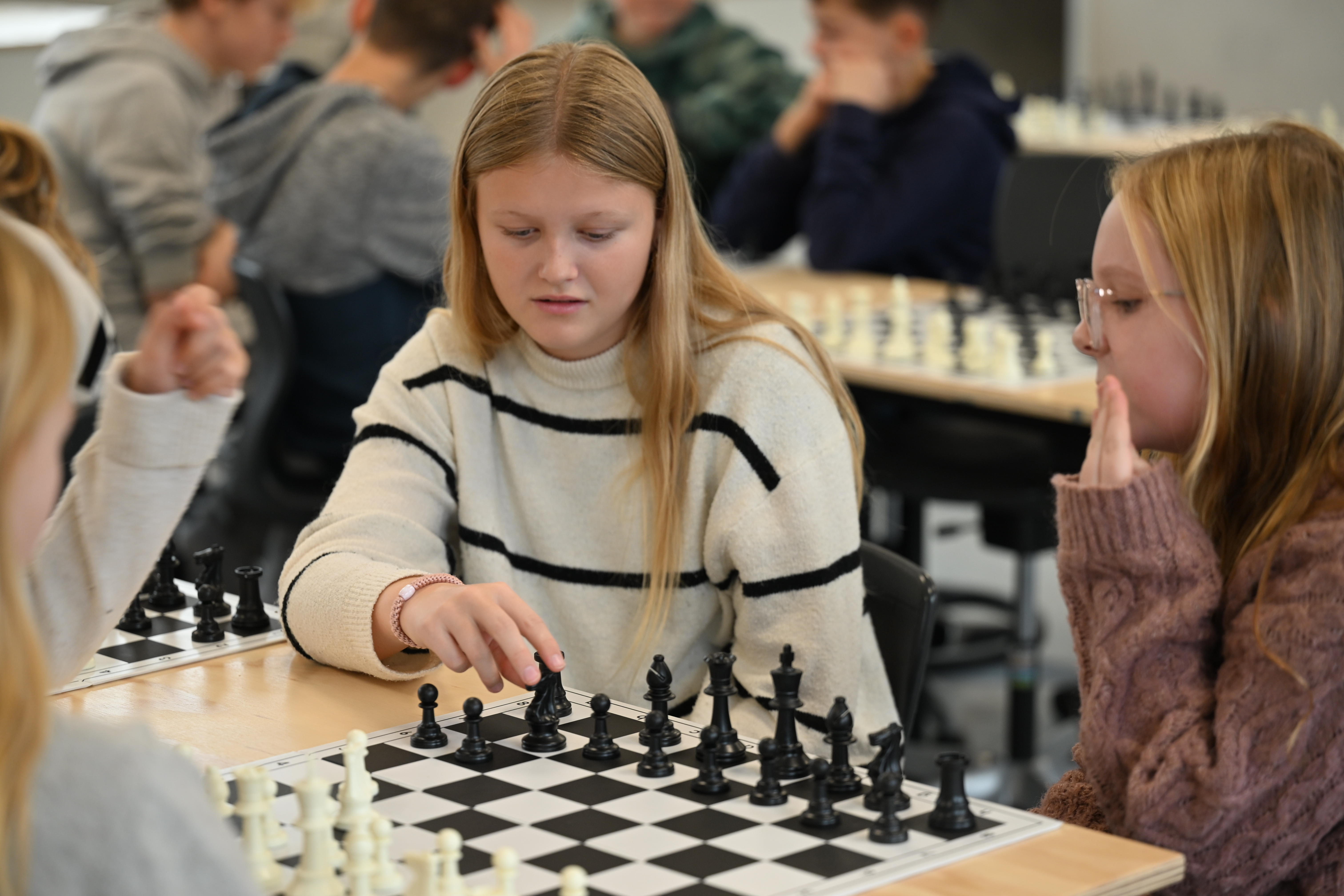 - Skak – på en anderledes måde. Udover at skulle tænke strategisk blev der løbende tilføjet nye udfordringer. Blandt andet skulle eleverne spille i par, hvor den ene var ”hjernen”, der udtænkte trækkene, mens den anden var ”armen”, der flyttede brikkerne. De måtte ikke tale sammen, men skulle samarbejde ud fra klare instruktioner – en øvelse i logik, koordinering og forudsigelse, som en del af matematikken.